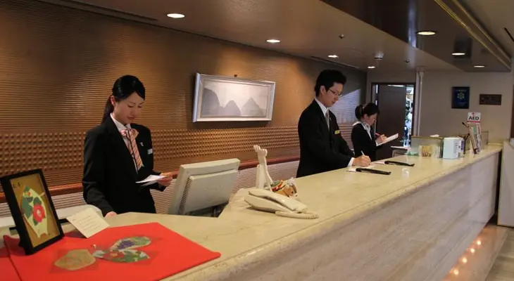 “The lobby is beautifully lit by pale-pink lighting that descends from the ceiling in a graceful curve and recalls the wisteria blossoms in Kasuga Taisha shrine.”