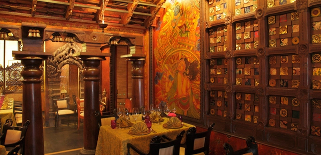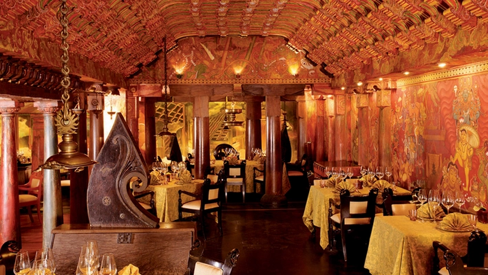 "This fantastical restaurant, hand-painted by temple artists flown in from Kerala, resembles a temple (or at least an Indiana Jones movie)."