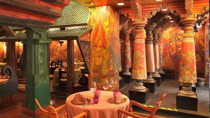 “This fantastical restaurant, hand-painted by temple artists flown in from Kerala, resembles a temple.”
