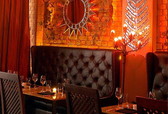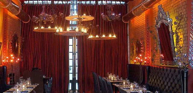 "The restaurant looks like a Bollywood interpretation of a bordello, with button-dimpled black leather banquettes and piped-in techno." Full review