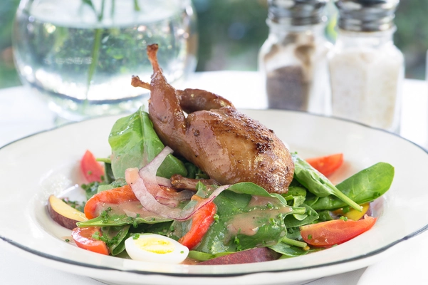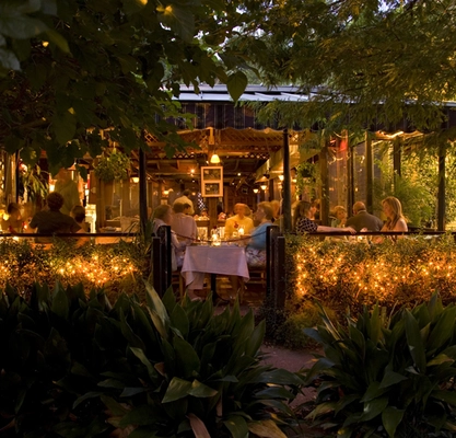 "Rich French classics in a charming, treehouse-like patio."