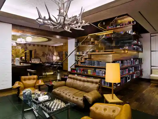 "The lodgelike lobby reflects the group's luxury aesthetic with leather sofas, a faux antler chandelier and photographs by the late society lensman Slim Aarons." Full review