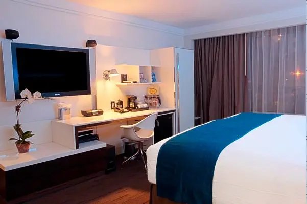 "This eight-story tower, designed by Andres Escobar, has 48 rooms loaded with all the perks of a modern, hip hostelry: 42-inch plasma-screen TVs, Wi-Fi and Bose stereo systems."