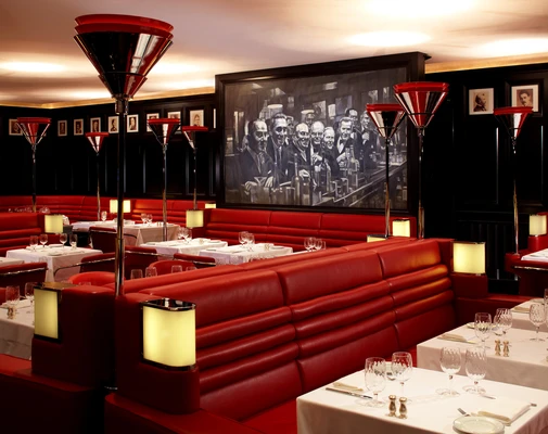 "For the interiors, Thierry Despont put an updated twist on Art Deco: from the red-leather banquettes and a limestone fireplace to the terrazzo floors and leather-wrapped closets." Full review