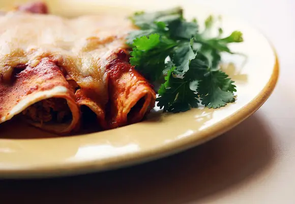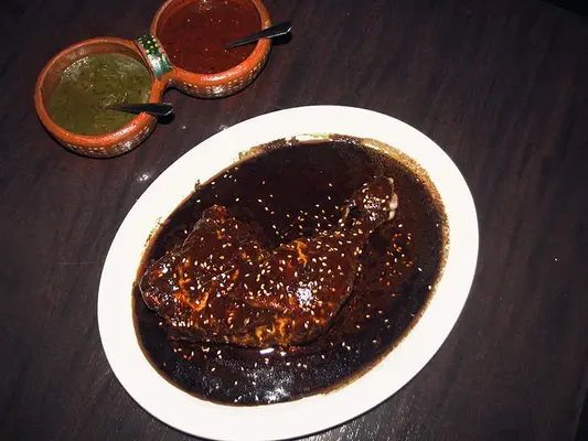 "One smoky special includes chiles rellenos (roasted poblano chilies stuffed with cheese in a light cream sauce). Other delights are a juicy chicken thigh and drumstick swimming in rich mole." Full review