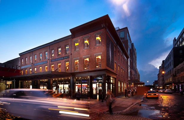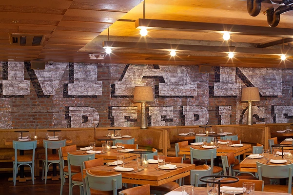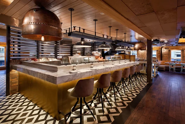 "The 260-seat space features an oyster bar and bistro on the first floor, an open kitchen and two chef's tables on the second level, and a glass-enclosed lounge and rooftop terrace in the penthouse." Full review