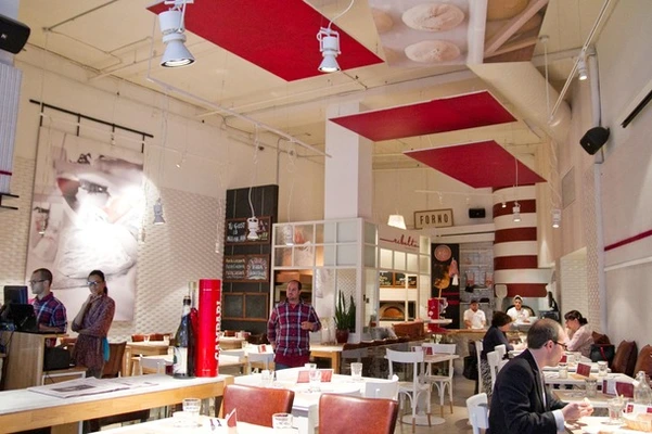 “Three distinct pizza ovens bake three varieties of traditional pizza pies—Napoletana, pizza in Pala and classica—in a space with a full bar boasting Italian wines.”