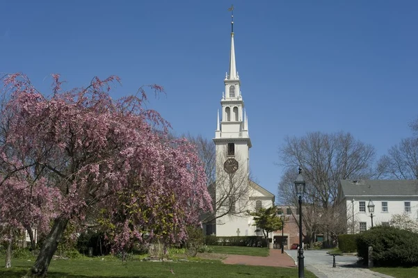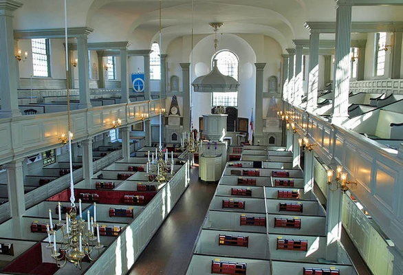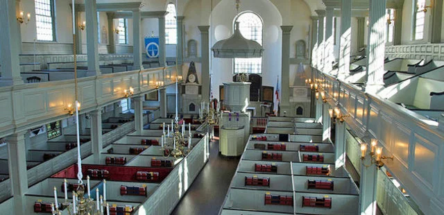 “Built between 1725 and 1726, it has a fine wineglass-shaped pulpit, Tiffany stained glass, traditional box pews...and an organ once played by Handel.”