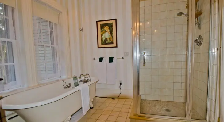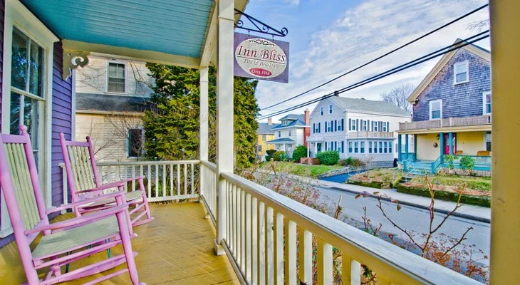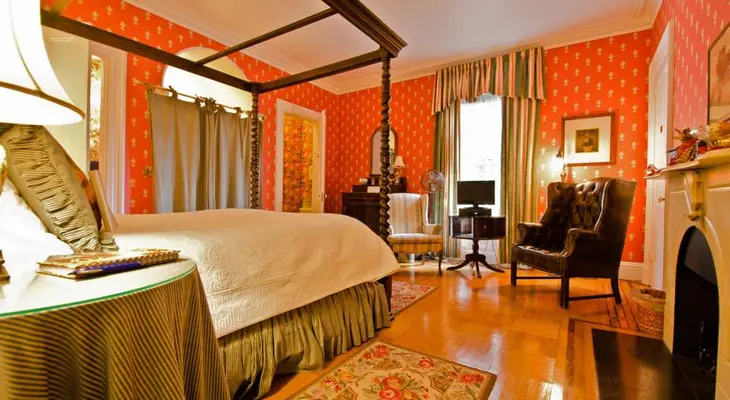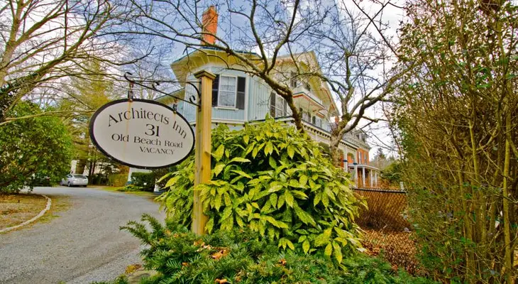 “This distinctive Swiss chalet–inspired house completed in 1873 has good-size guest rooms decorated in classic Victorian style. All have fireplaces, some have antique claw-foot bathtubs.”