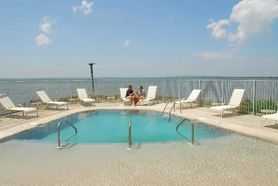 “An open-air patio, painted a sunny terra-cotta hue, serves to greet guests with comfortable benches, colorful wall art and a picturesque view of the Isle of Wight Bay. ”