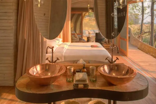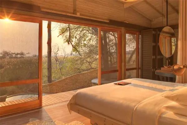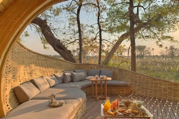 “One of the most architecturally stunning camps in Botswana’s Okavango Delta, &Beyond Sandibe was built within a private concession adjacent to the wildlife-filled Moremi Game Reserve.”