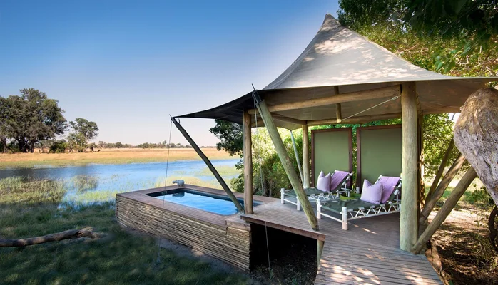 “At tents on raised platforms, guests retire to their salas for an afternoon siesta overlooking the floodplains.”