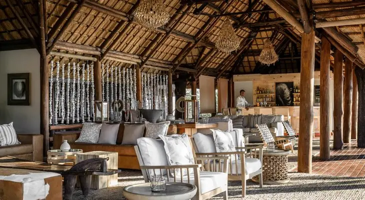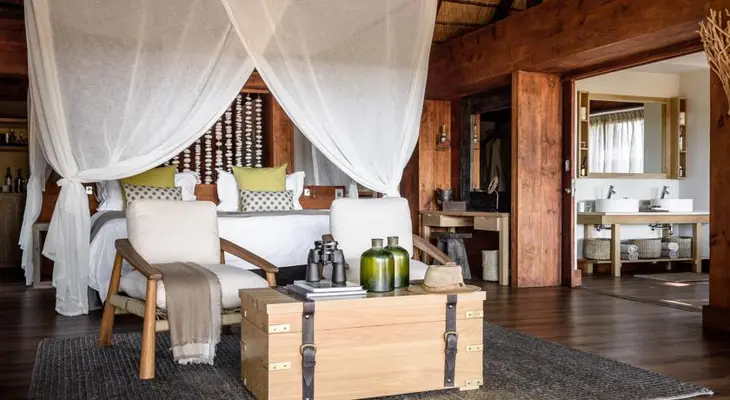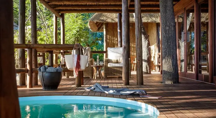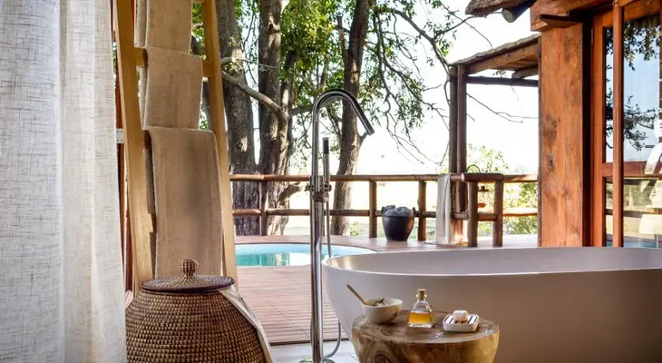 "On the northwestern tip of Chief's Island in the middle of the Okavango Delta and shaded by jackalberry, sausage, and rain trees, the 10 spacious thatched-roof pavilions at this camp come equipped with private viewing decks, outdoor showers, and plunge pools" Full review