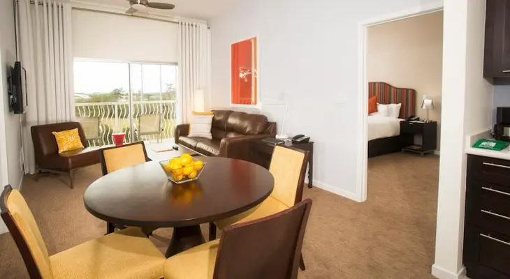 "Located in the community of Celebration, just minutes from the Walt Disney World theme parks, this hotel features 240 one- and two-bedroom suites."