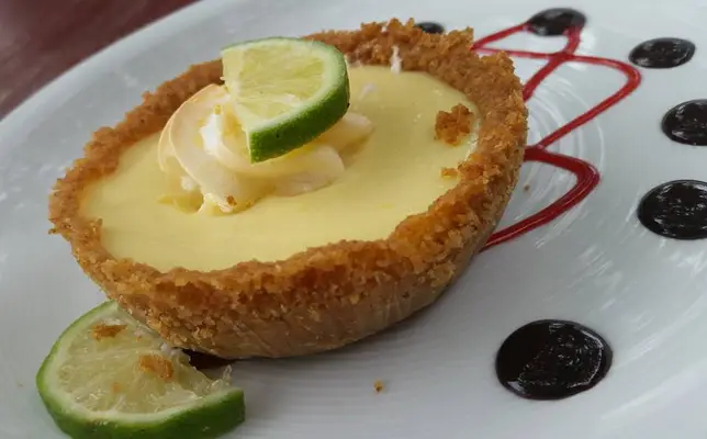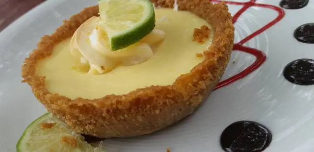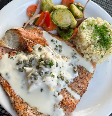 A mix of comfort food and bistro classics—think fried green tomatoes, Key West crab cakes, pork chops with Bavarian sausage, lobster ravioli, burgers. Not really a place for dining light.