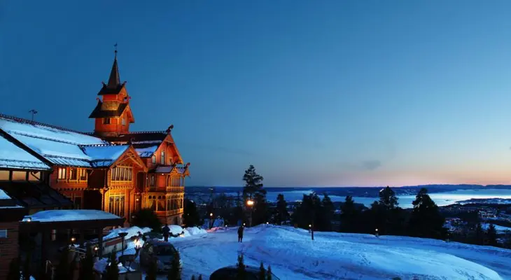 “This eye-catching luxury hotel was built in the Norwegian “dragon” style over 100 years ago and is situated high above the centre of Oslo, affording a unique view of the city and fjord.”