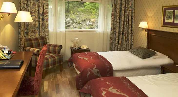 "Impressive 1894 red wood building once used as a sanitorium for TB patients. Mix of classic and modern bedrooms with good comfort levels; some with city or fjord views."