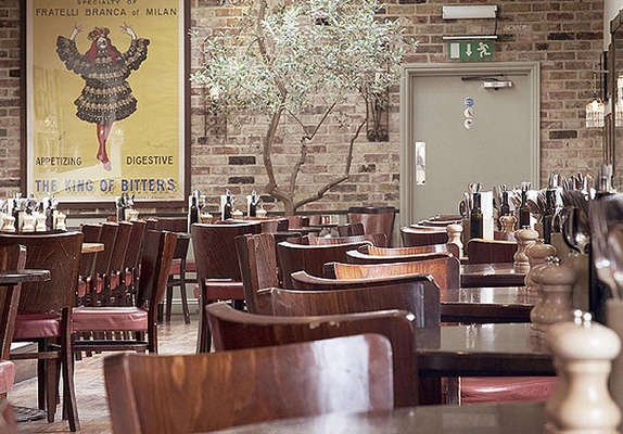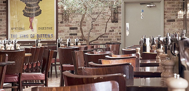 “Bustling restaurant with a spacious, modern interior and French doors opening onto a courtyard terrace.”
