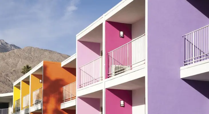 "At The Saguaro, the area’s quintessential mid-century modern vibe gives way to bright colors --- from Crayola exteriors to multi-hued guest rooms."
