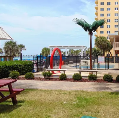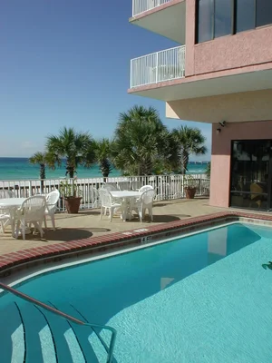 “This family-friendly, large beachfront motel offers heated pool, hot tub and beach bar.”