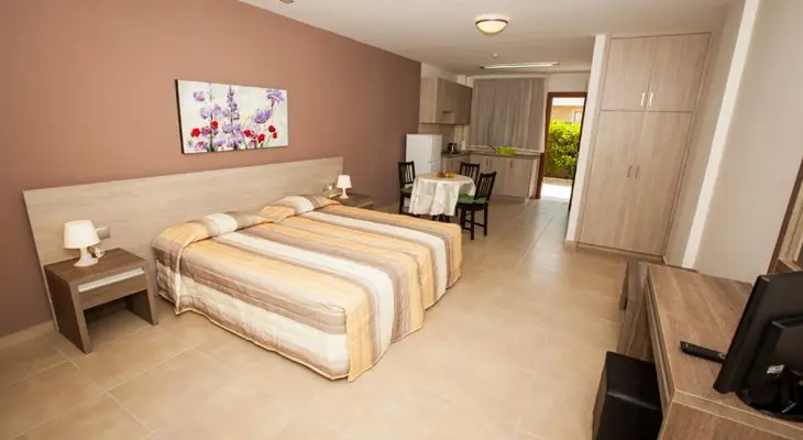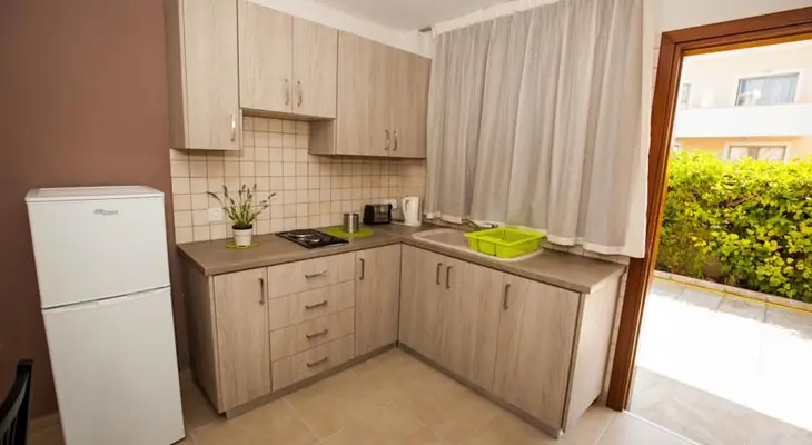 “These spacious studio apartments in Kato Pafos are well equipped with kitchenettes (including plenty of pots and plates), dining table and chairs, sofa, comfy chairs, TV and small terraces.”