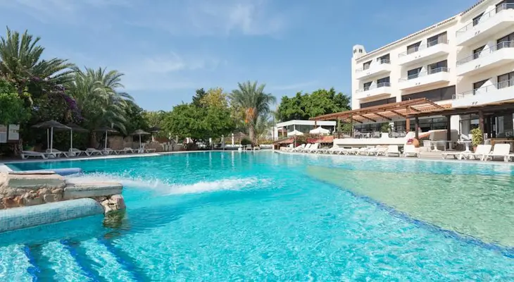 “Paphos Gardens Holiday Resort is a three-pearl resort hotel located a six-minute walk from the beach on a quiet, residential street.”