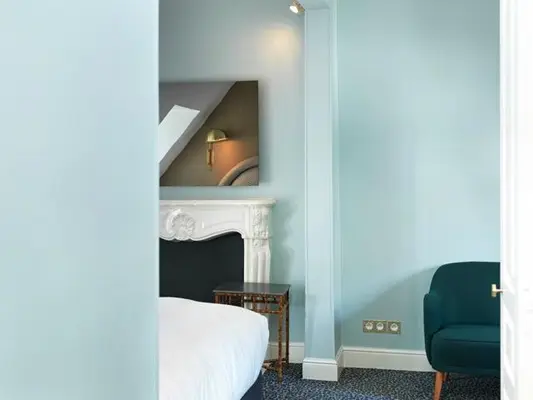 “A night-blue colour palette with touches of gold gives the hotel and its thirty seven rooms a Romantic classic Parisian atmosphere.”