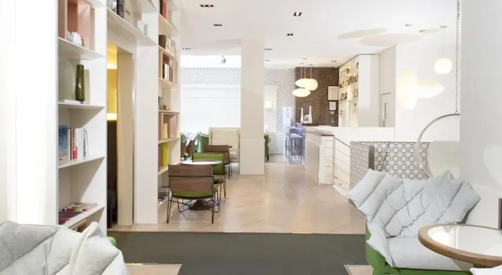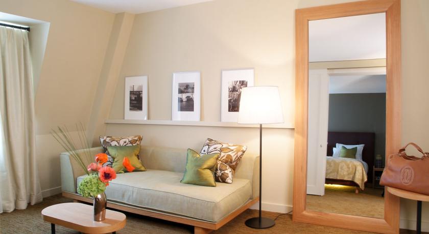 “Built in a former eighteenth-century printing factory and located in the Saint-Germain-des-Prés district, this understated hotel boasts a pared-down and colorful décor.”