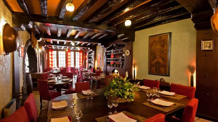 "When you enter this rustic tavern through a bar that's heavy with oak beams, hanging hams, and ceramic plates, you feel immediately like you've been transported to the Auvergne." Full review