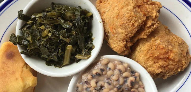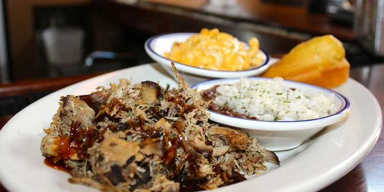 “Menu highlights include gumbo, fried green tomatoes, secret-recipe blue crab cakes, Southern fried chicken, and pulled-pork BBQ.”