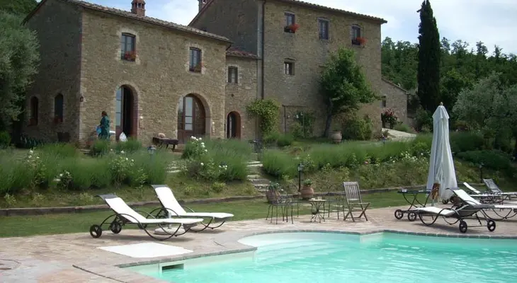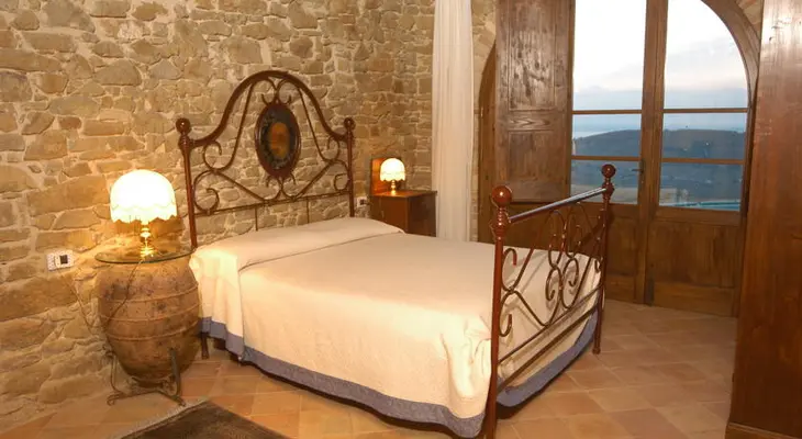 "The house is in an olive grove, surrounded by forest, overlooking Lake Trasimeno. There is a pool with panoramic views, a vaulted restaurant, a spa and a meditation trail through the gardens. "