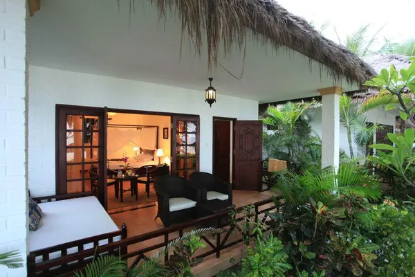 “This is a luxurious private paradise on the beach, with thatched-roof bungalows and villas set in a lush one-hectare garden of coconut trees, orchids, tropical plants, and Cham-style sculptures.”