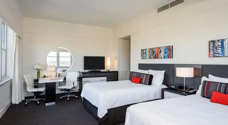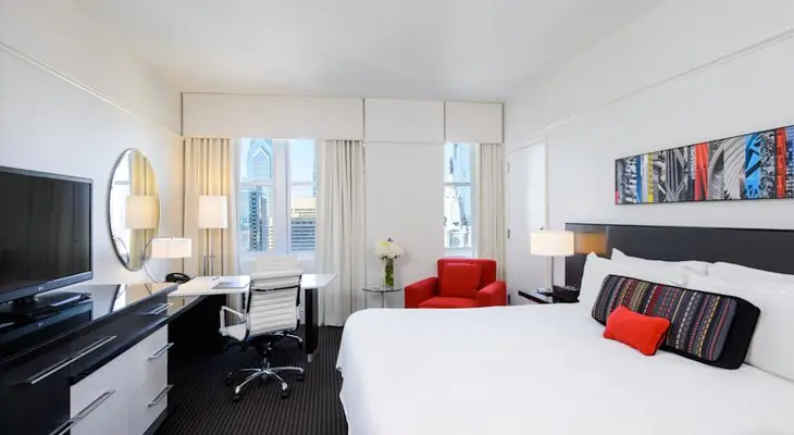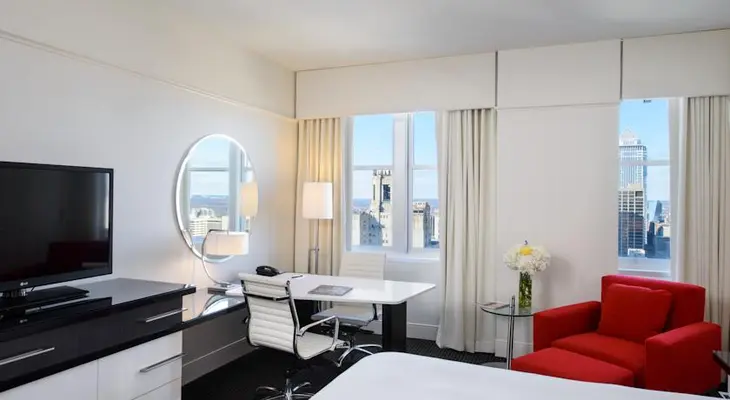 “Art deco tower with 581 rooms, restaurants, huge fitness center; child and pet friendly; kids’ fun center offers loaner toys including PlayStation. ”
