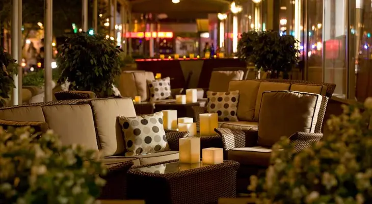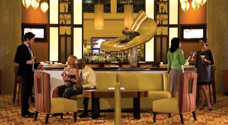 "The hotel takes up an entire city block, and the lobby reception area resides in a 5-story atrium, complete with music, landscaping and a flowing fountain."