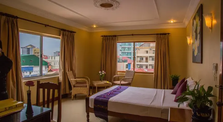 "Situated in the peaceful NGO area near Independence Monument, a 10-minute walk from the downtown area, this family-run, mid-range choice has large, high-ceilinged rooms with free Wi-Fi."