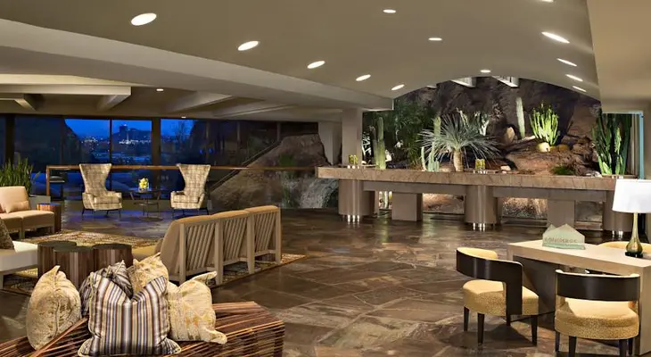 “This spectacular and contemporary resort...affords spectacular views of the Valley and mountains. ... The hotel's signature facility is the futuristic Top of the Rock restaurant and cocktail lounge.”
