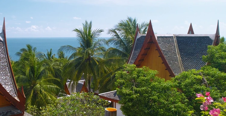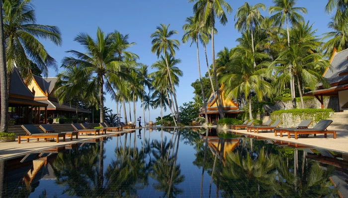 "Amanpuri aptly reflects the tranquility and peace after which it is named. This luxurious pavilion and villa complex, nestled within coconut groves, overlooks a white sand beach."