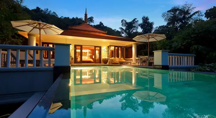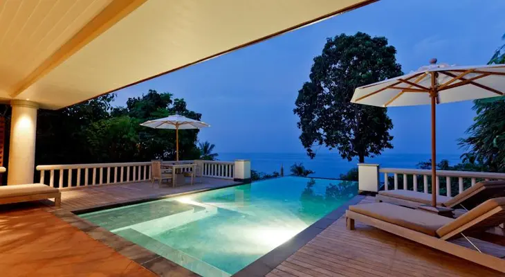 "Located only 15 minutes from Phuket, this exclusive property is well-designed on a sloping hill between two private headlands.... The property's accommodations feature private infinity edge pools."