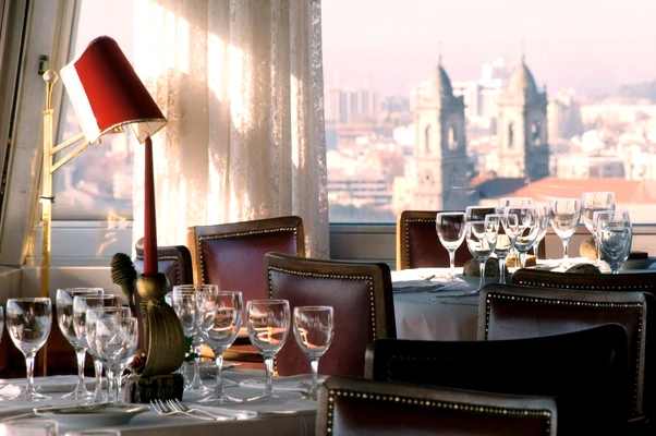 "Portucale serves excellent food in an intimate atmosphere with outdated decor, elegant table settings, and stunning views of the city."