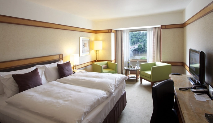 "An imposing 1970s building set on the banks of the Vltava, this hotel has excellent health and fitness facilities and a swimming pool."