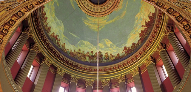 "The active seat of Rhode Island's government...the State House dome is the world's fourth largest self-supported dome...a painting by Rhode Island artist James is visible on the inside of the dome." Full review