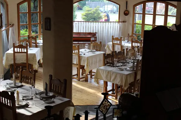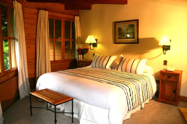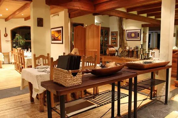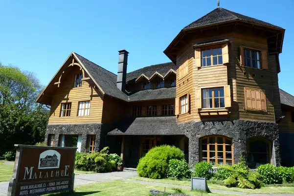 “Dark wood and volcanic rock were used in building this hotel at the edge of Pucón, on the road to Calburga.”