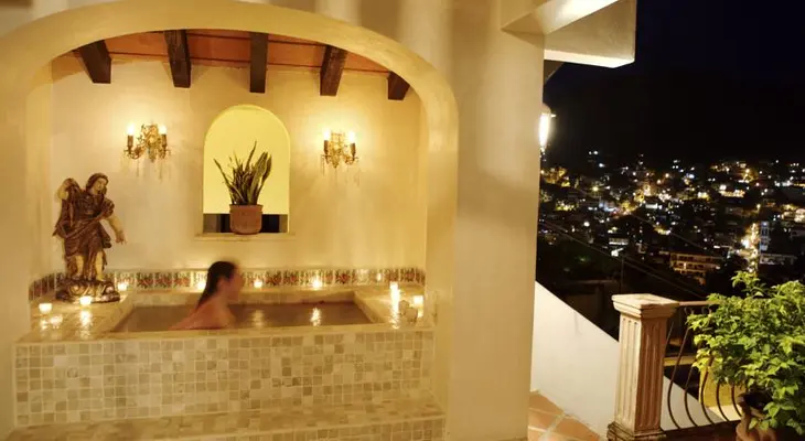 "Seven suites and a wedding chapel are located on a steep hillside across the street from the main hotel, affording spectacular views of downtown Puerto Vallarta, the malecón, and the bay."