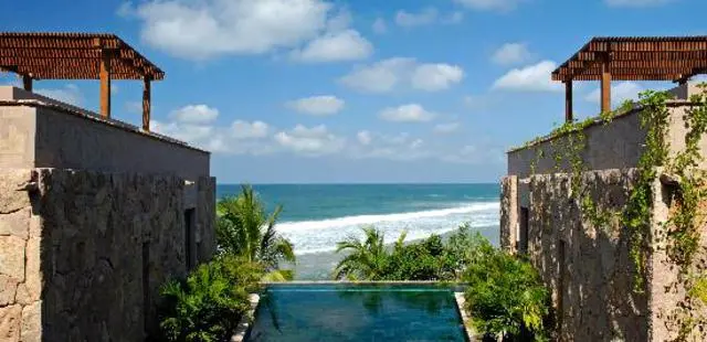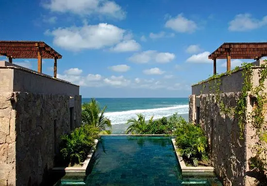 "Perched above the beach, its seven striking villas use mostly local Mexican stone, wood, and glass but have an almost Asian feel, with huge floor-to-ceiling sliding glass doors and sunken tubs."