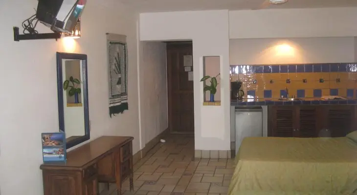 “Studios here have functional kitchenettes, basic cookware, and somewhat thin mattresses on wood-frame beds.”