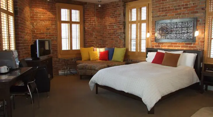 "Upscale boutique hotel in Saint-Roch boasting ten exquisitely designed and spacious rooms, each with exposed brick walls, tall windows, cable TV and free wi-fi."