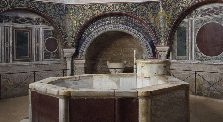 This octagonal baptistery was completed in the 5th century by Bishop Neone on the site of an ancient Roman bath. — Frommer's