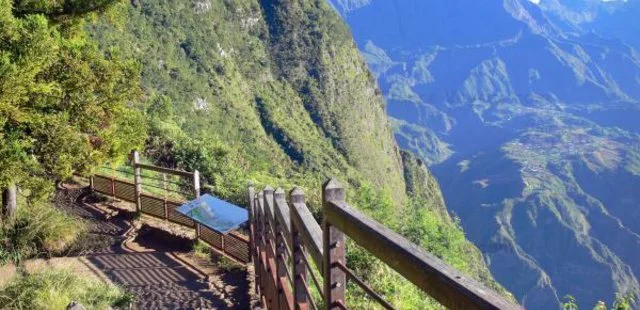 “At the end of a pretty forest road lined with blue hydrangeas, La Fenêtre affords an extraordinary view of the Cirque de Cilaos and the striking silhouettes of Grand Bénare (2,896m).”