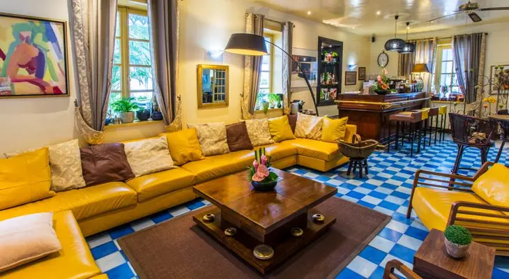 “The yellow and blue interior spaces are warm, welcoming, and tastefully decorated in Ligne Roset designs.”