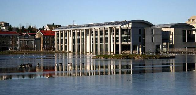 “Reykjavík’s waterside Ráðhús is a beautifully positioned postmodern construction of concrete stilts, tinted windows and mossy walls rising from Tjörnin.”